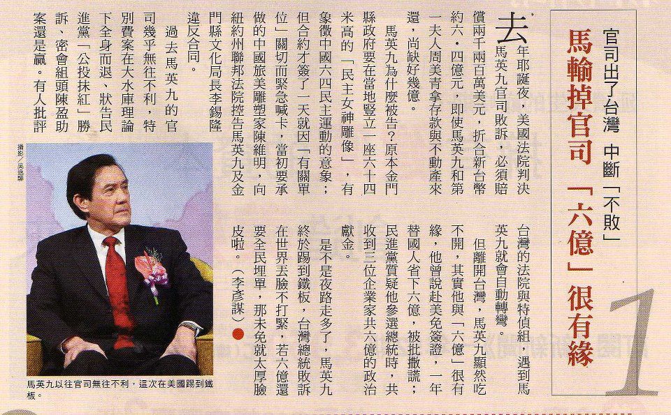 請問︰馬英九是總統,總統在美國被告,不是新聞嗎?官司輸了,不是新聞嗎?如果真要賠償六億多台幣,是你我納稅人的血汗錢,不是新聞嗎?請新聞傳播學者、各報社的總編輯、各電視台的新聞部經理們告訴閱聽人,為什麼台灣看不到這則新聞?是總統挨告不值得報導嗎?是六億四千萬錢太少嗎?還是台灣媒體不敢報導?