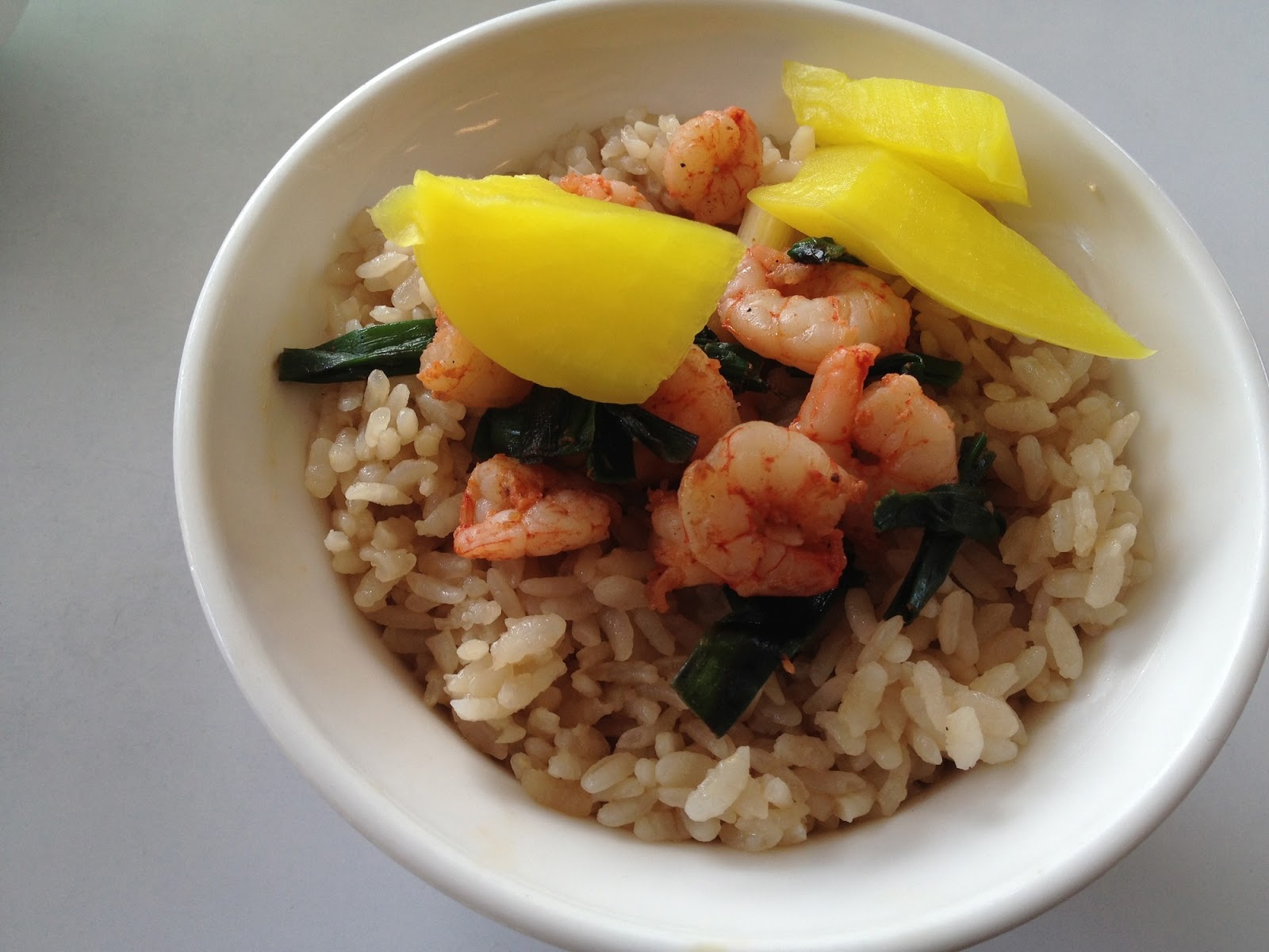 這蝦仁飯最特別的就是用特殊的醬汁伴炒過,吃起來甜甜的,搭配另外翻炒、爆香過的蝦仁,一整個美味!另外桌上還擺了一小鍋的醬瓜(黃色醃蘿蔔),搭配蝦仁飯一起吃也是超好吃!